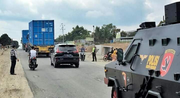 Terlihat kendaraan (Truk Container) yang membawa logistik F1H2O selama dalam perjalanan menuju Kabupaten Toba mendapat pengawalan ketat dari Satuan Brimob dan Satuan Lalu Lintas Polres Simalungun.