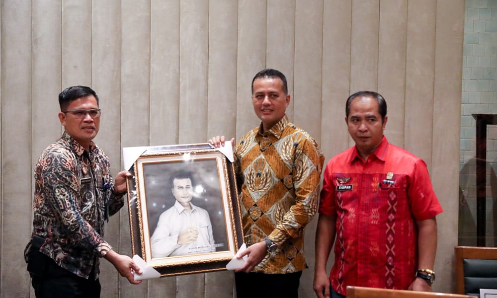 Medan,Metrodua.com - Wakil Gubenur (Wagub) Sumatera Utara (Sumut) Musa Rajekshah menerima lukisan foto dirinya yang dibuat langsung oleh warga binaan yang sedang menjalani hukuman di Rutan Kelas 1 Tanjung Gusta Medan . Lukisan itu diserahkan langsung Kepala Rutan Kelas I Medan Nimrot Sihotang usai melakukan audiensi dan silaturahmi di JW Marriot Medan, Jumat (10/22023).